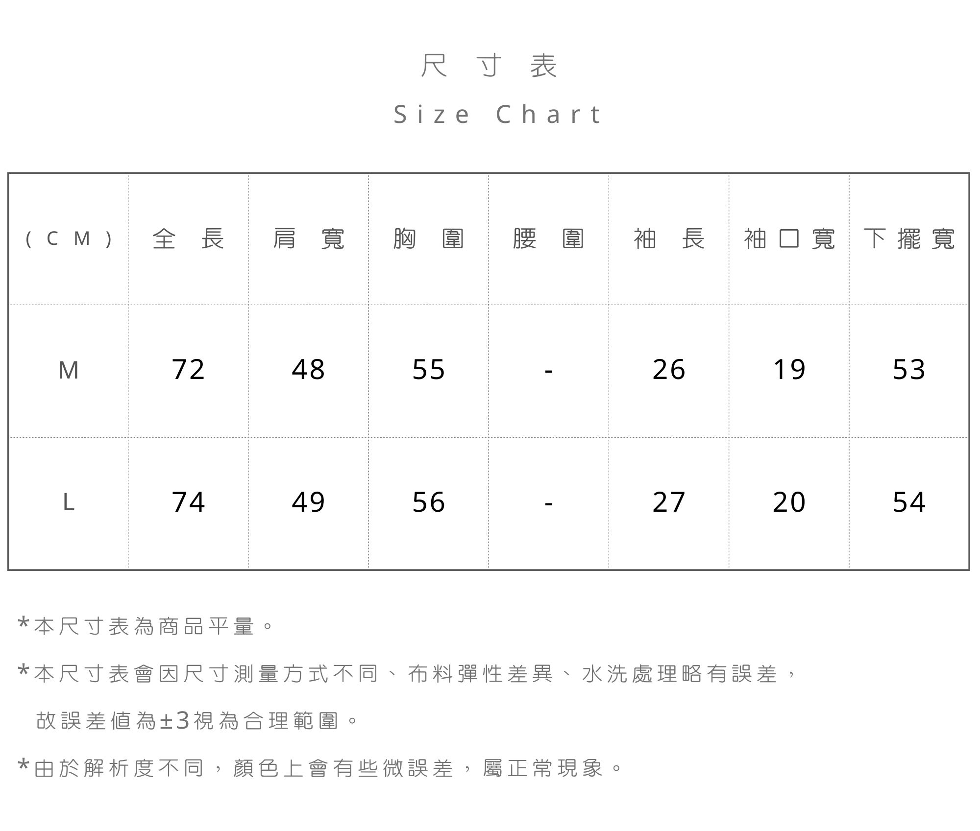※本尺寸表會因布料彈性、水洗處理、測量起訖點等因素,與實際商品尺寸會略有誤差,誤差值為±3視為合理範圍。